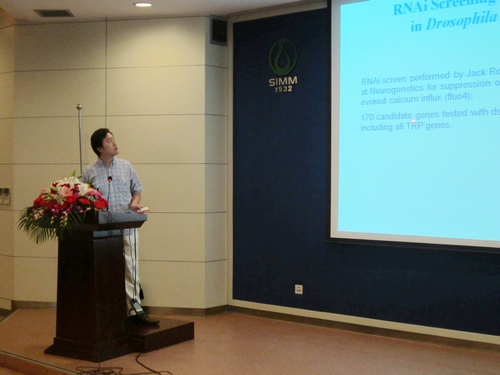 张慎元教授介绍了该科研小组近年来在Ca2+信号传导通路的研究进展,重点介绍了两种新的SOC通道蛋白亚基Stim1和Orai1的发现、功能以及通路作用机制,描述了Stim1作为SOC通路激活的ER中 Ca2+传感器的作用,Orai1作为SOC通道孔组成亚基(pore-forming subunit)其中重要片段的作用。当ER中Ca2+浓度下调时,激活Stim1转移到质膜上,与Orai1 C端结合作用,N端的弱结合作用,激活通道开放,从胞外释放进Ca2+,上调胞浆中Ca2+浓度。此外张教授领导的研究小组通过点突变的改造实验,研究了通道开放与关闭的作用机制。同时期待能与上海药物研究所合作,致力于将其作为潜在药物靶标,开发出免疫抑制剂来治疗自身免疫紊乱和解决器官移植中的排斥问题。张教授的报告语言生动、表述清晰、简洁准确,获得了与会老师和同学的一致认可,报告结束后很多同仁和同学都提出了与离子通道研究相关的问题,张教授都予以了详细解答,会场讨论气氛热烈而活泼。