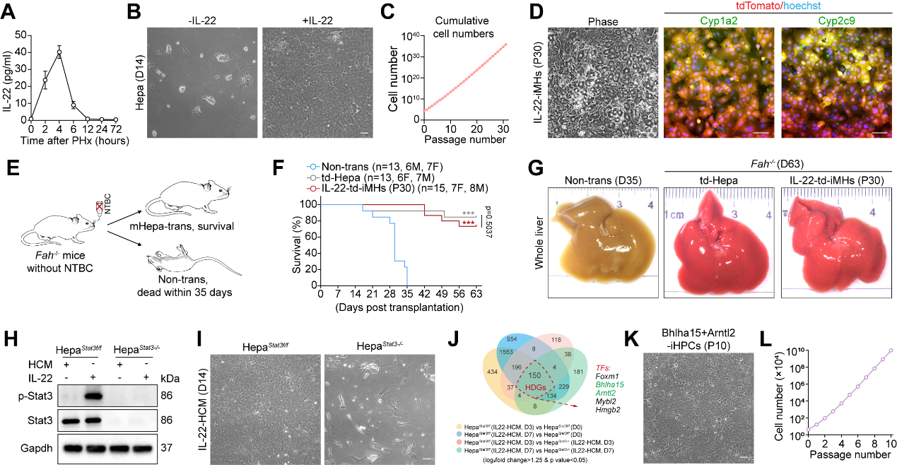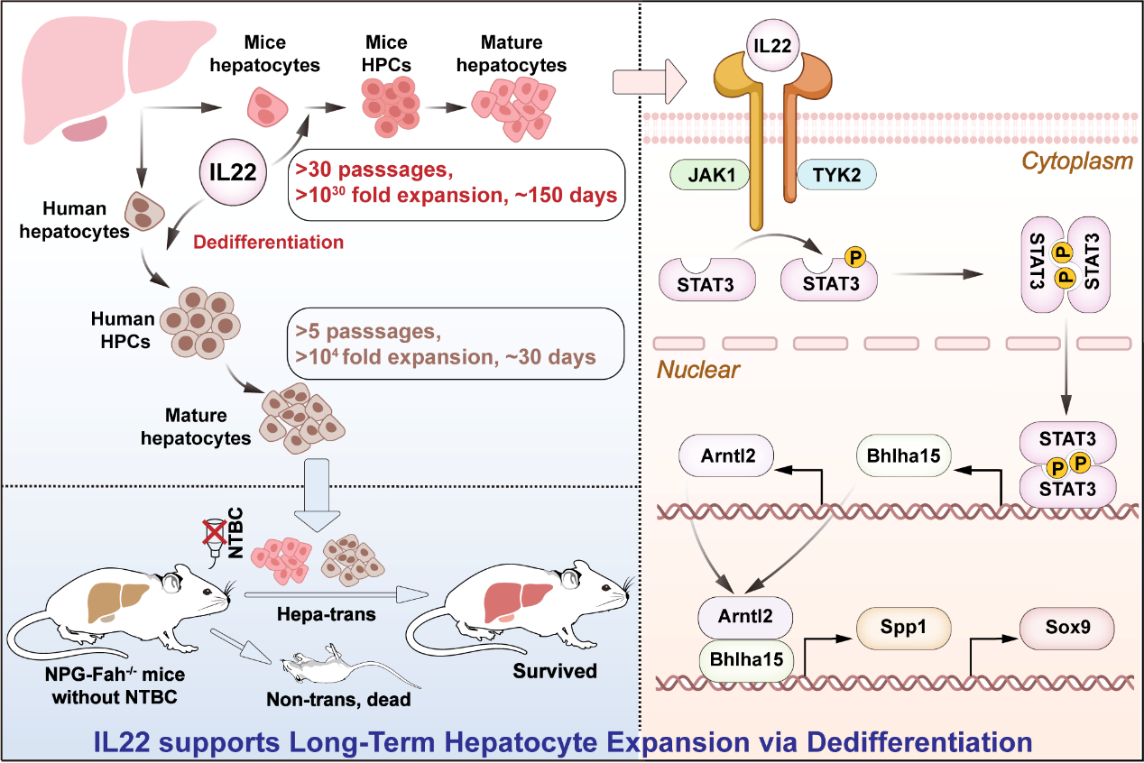 中国科学院上海药物研究所谢欣研究员团队长期致力于肝细胞体外扩增的研究。该团队于2022年报道了包含IL-6的培养条件可以支持小鼠原代肝细胞体外大量扩增和功能维持(Nature Communications 2022;13:7345.)。在本研究中,研究人员首先从发现体内调节肝再生的细胞因子出发,发现在肝切除再生和肝细胞移植模型中,细胞因子IL-22的表达均显著上调。将IL-22添加到小鼠原代肝细胞的培养体系中,小鼠肝细胞可稳定扩增超过30代。通过实验及估算,小鼠肝细胞在150天内扩增超1030倍。肝细胞在增殖过程中会去分化为肝祖细胞(IL-22 induced hepatocyte progenitor cells, IL-22-iHPCs),并且IL-22-iHPCs可再分化为成熟的肝细胞(IL-22 induced mature hepatocytes, IL-22-iMHs)(图1)。为验证扩增后的肝细胞的功能,研究团队将扩增30代后的IL-22-iMHs移植到酪氨酸血症模型小鼠(Fah-/-小鼠)肝脏中,结果表明IL-22-iMHs能显著提高Fah⁻/⁻小鼠存活率,并在移植60天后重建Fah-/-小鼠~90%的肝脏(图1)。机制研究表明,IL-22主要通过激活Stat3信号通路和其下游关键转录因子Bhlha15和Arntl2诱导肝细胞去分化和增殖。敲除Stat3基因后,IL-22的促增殖作用几乎被完全阻断。在肝细胞中特异性表达转录因子Bhlha15和Arntl2,则可在不依赖IL-22条件下诱导肝细胞长期增殖(图1)。