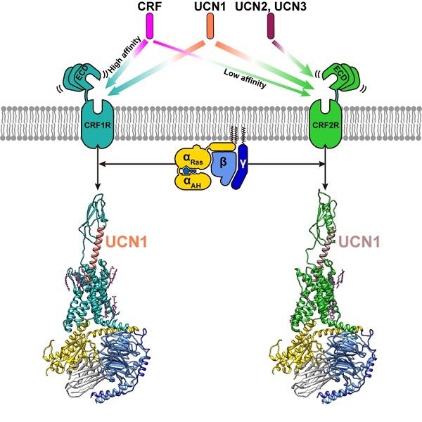 图1:促肾上腺皮质激素释放因子受体与配体的结合特异性和受体与Gs蛋白复合物的冷冻电镜结构。