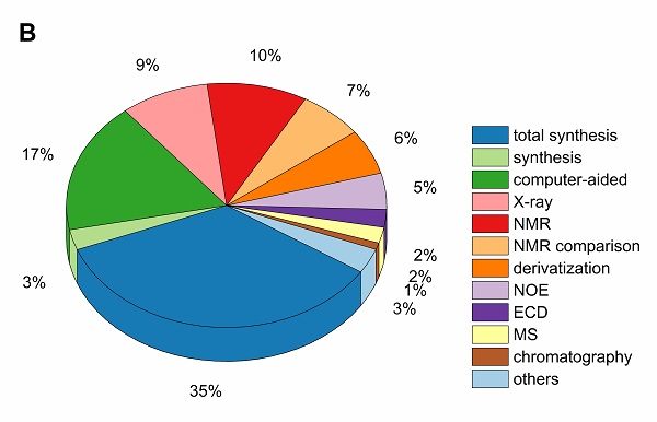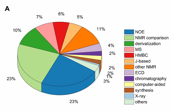 研究团队总结了2010~2021年间由于波谱技术不当应用导致MNPs结构鉴定错误(图1A),以及修正、纠正错误结构的方法 (图1B)。科研人员发现,基于NOE分析误导 (含NOESY/ROESY) (23%) 或直接NMR比较 (23%) 是MNPs结构鉴定错误的最主要原因,其次是不正确地化学衍生化分析 (10%) 和质谱分析 (7%) (图1A)。另一方面,这些错误的修正一般基于有机全合成方法 (38%)、NMR再分析 (17%)、单晶X-ray分析 (9%) 等。此外,近年来计算机辅助量子化学计算方法的应用有效提高结构鉴定的准确性,约占修正的17% (图1B)。