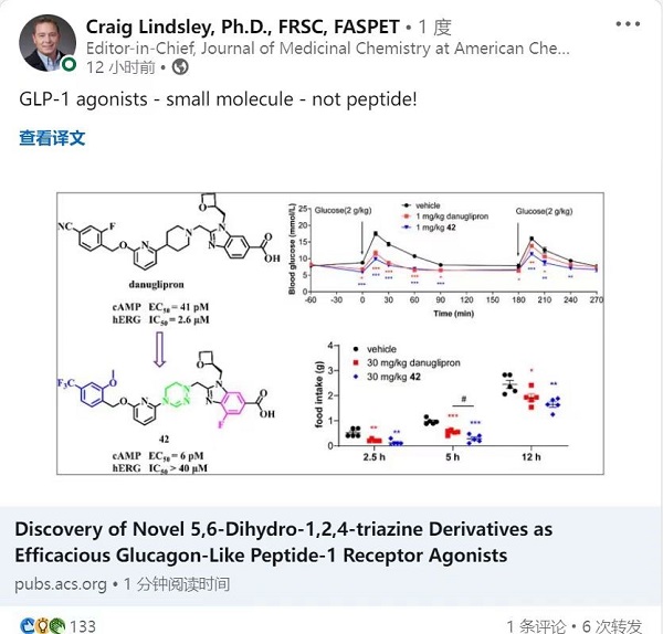 2023年6月7日,中国科学院上海药物研究所沈建华课题组和谢欣课题组合作,在Journal of Medicinal Chemistry上发表了题为“Discovery of Novel 5,6-Dihydro-1,2,4-triazine Derivatives as Efficacious Glucagon-Like Peptide 1 Receptor Agonists”的文章,报道了合作团队在小分子GLP-1受体激动剂的研究中所取得的阶段性进展。