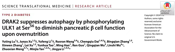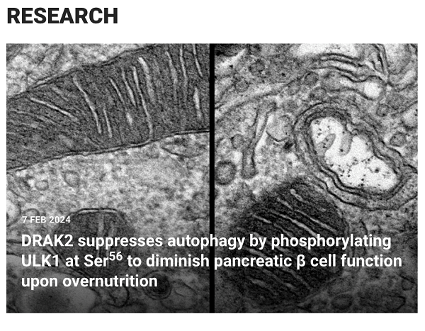 2024年02月07日,李静雅课题组和谭敏佳课题组合作,联合浙江大学基础医学院孟卓贤课题组、上海交通大学附属仁济医院吴琳石研究团队于Science Translational Medicine杂志发表题为“DRAK2 suppresses autophagy by phosphorylating ULK1 at Ser56 to diminish pancreatic cell function upon overnutrition”的研究成果。研究首次揭示了DRAK2(死亡相关凋亡诱导蛋白激酶2)与自噬/线粒体自噬起始复合物关键蛋白ULK1存在相互作用并磷酸化ULK1-Ser56位点后,促进其泛素化降解、阻滞线粒体自噬介导线粒体稳态失衡的分子机制,为糖尿病缓解提供了潜在干预靶标。
