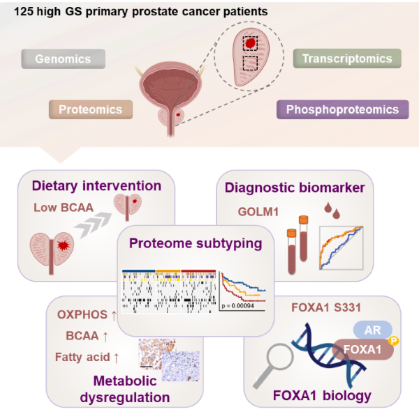 前列腺癌(PCa)呈现出东西方人群基因组层面的差异性,这反映在癌症基因组和疾病进展的不同变化中。在本项工作中,研究人员针对125例癌和癌旁配对的临床原位高危前列腺癌样本进行了蛋白基因组学的全景解析,以增强对于高危前列腺癌预后,诊断和治疗的理解。为了实现这一目标,研究人员将研究重点放在揭示不同预后特征的分子亚型,揭示关键的致癌磷酸化事件,以及探索精准诊断和预后的生物标志物上。基于蛋白质组学的分子分型,研究人员发现预后最差的S-III亚型中代谢信号和癌症通路则更加显著地被激活。进一步的机制解析发现,支链氨基酸代谢途径关键酶BCAT2的高表达提高了癌组织对于支链氨基酸的利用,促进了前列腺癌的增殖。基于磷酸化组学的全景分析,研究人员确定了FOXA1-S331磷酸化修饰能促进下游AR信号通路的活化过程,而抑制FOXA1-S331磷酸化修饰水平则能够减缓前列腺癌的进展过程。此外,基于蛋白质组学和临床数据的整合分析,研究人员发现GOLM1可以作为一种潜在生物标志物,用于诊断PSA(前列腺癌特异性抗原)“灰区”的前列腺癌患者。研究表明,在PSA灰区,血清GOLM1具有更高的特异性和灵敏度。