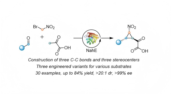 本研究通过对I型丙酮酸醛缩酶NahE的功能重构和定向进化,成功将醛缩酶NahE改造为可以催化aldol、脱水、Michael加成及分子内SN2取代反应的多功能生物催化剂,实现了环丙烷骨架的不对称从头合成,所获得的突变体可兼容多种芳香醛和脂肪醛类底物,以优异的对映选择性(>99% ee)和非对映选择性(>20:1 dr)高效获得目标产物。该工作不仅展示了I型醛缩酶作为多功能酶的催化潜力,也拓宽了其在不对称合成中的应用,为高附加值环丙烷化合物的绿色制造提供了新思路。