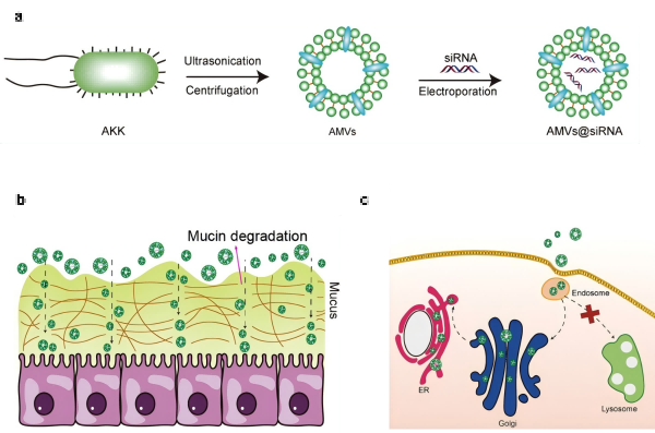 2025年11月19日,中国科学院上海药物研究所团队与上海健康医学院附属周浦医院团队合作于Advanced Materials在线发表题为“Akkermansia Muciniphila-Inspired Oral siRNA Delivery by Active Matrix-Penetration and Intracellular Endoplasmic Reticulum Accumulation”的研究工作。该研究利用肠道益生菌Akkermansia muciniphila的膜囊泡(AMVs)构建出新型口服siRNA递送系统,克服胞外基质和胞内降解屏障,实现了小干扰RNA(siRNA)的高效口服给药,并在小鼠结直肠癌模型中取得超过90%的肿瘤抑制率。这一研究为口服核酸药物的发展带来新机遇。