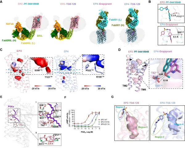 图1. (A)EP2-PF-04418948复合物、EP2-TG6-129复合物、EP4-Grapiprant复合物和EP4-TG6-129复合物的冷冻电镜密度图。(B, C, D)EP2和EP4拮抗态结构中结合口袋关键氨基酸残基的位置(B)、结合口袋电荷特性(C)和TM的相对位置(D)的显著差异。(E)EP2的活性和非活性结构的比较。PGE2结合的口袋(i)和TM7及TM6(ii)中残基的构象变化显示。氢键显示为红色虚线。红色圆圈表示原子之间的碰撞。构象变化由绿色箭头显示。(F)EP2激活中关键氨基酸突变体的cAMP活性曲线。(G)双重拮抗剂TG6-129结合EP2和EP4的结合口袋比较。