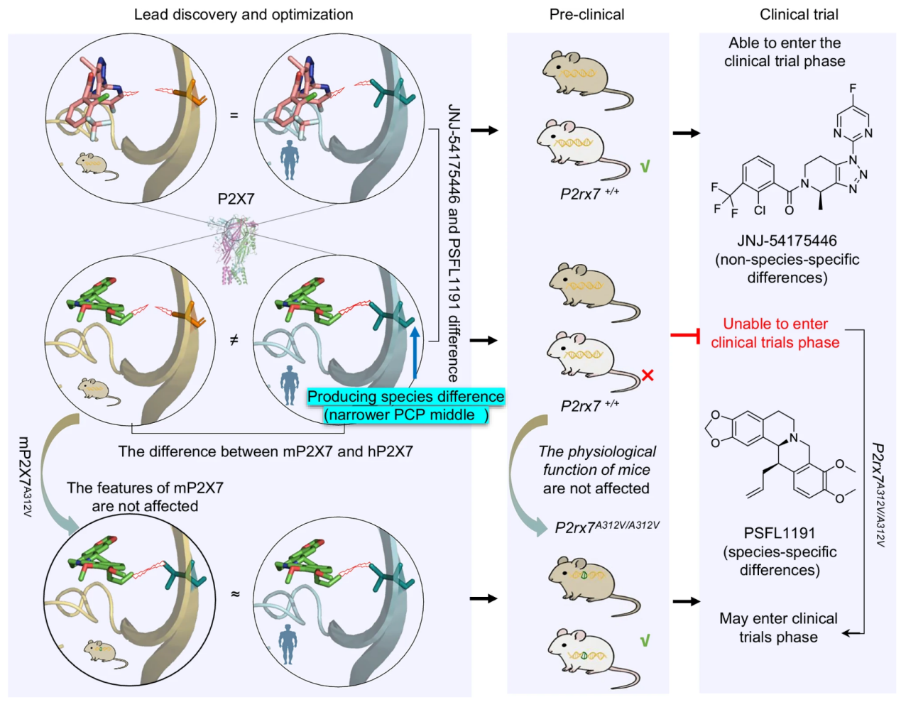 该研究以PSFL1191和JNJ-54175446为探针,从结构与药理层面揭示了P2X7受体种属药效差异的分子机制,并进一步开发了P2rx7A312V/A312V人源化小鼠评价模型,为存在种属差异性P2X7抑制剂的体内有效性和安全性评估提供了新的研究方法,也为P2X7抑制剂开发提供了良好的先导化合物。