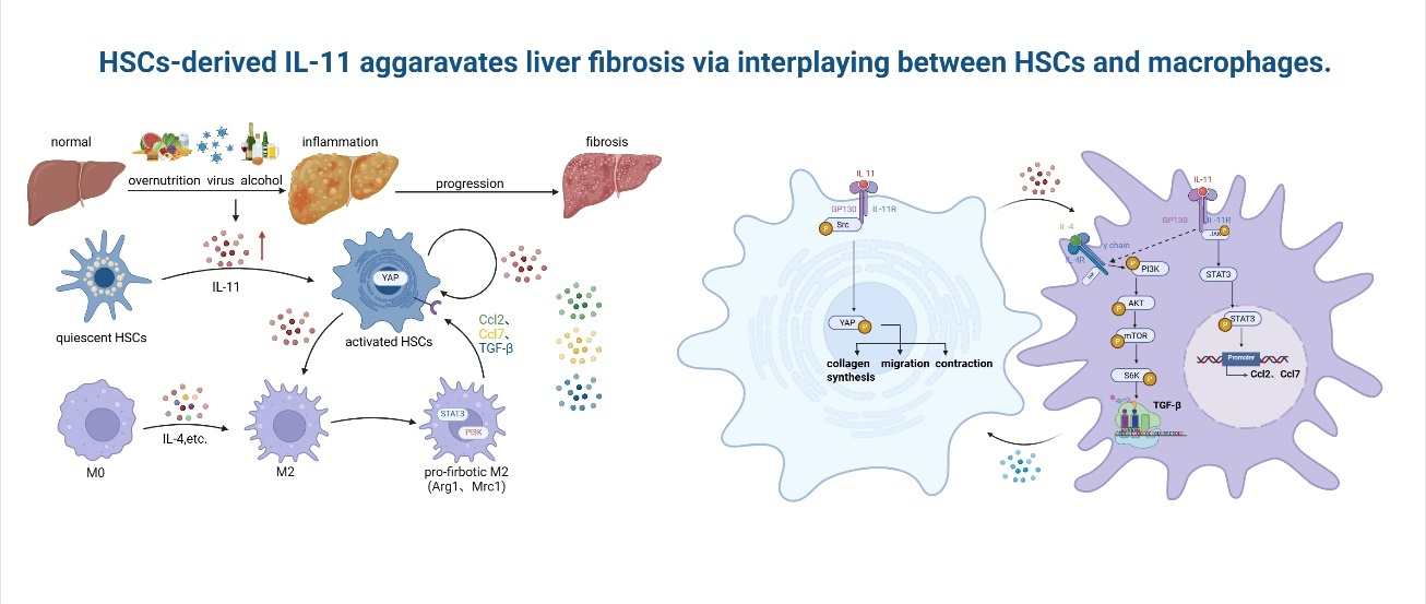 2026年1月1日,中国科学院上海药物研究所宫丽崑团队联合上海交通大学医学院临床医学研究院王炳顺团队,在国际学术期刊International Journal of Biological Sciences上发表了题为“Hepatic Stellate Cells-derived IL-11 Exacerbates Liver Fibrosis via Interplaying between HSCs and Macrophages”的研究论文。该论文主要揭示了肝脏星状细胞(HSCs)分泌的白细胞介素-11(IL-11)在驱动肝纤维化中的关键生物学功能,IL-11通过同时作用于HSCs自身和巨噬细胞,建立了一个自我放大的恶性循环,从而持续加剧疾病进展。