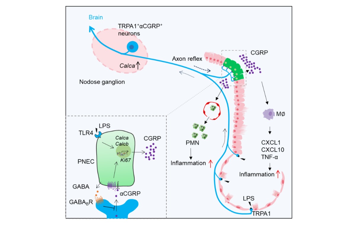 机制上TRPA1可以识别LPS,促进神经元的MYD88寡聚化,增加神经元钙内流和活化。神经节转录组分析发现LPS刺激后NG神经元中αCGRP(Calca)表达显著升高;这些神经元主要为TRPA1+ 神经元。αCGRP+ NG神经元广泛投射至肺神经内分泌细胞簇(PNECs/NEBs)。神经末梢释放的CGRP可以激活PNECs 的CGRP受体促进Calca的转录。PNECs产生的CGRP可以促进肺部中性粒细胞炎症反应。因此特异性消融或敲除NG中的αCGRP神经元均显著减弱PNECs中CGRP表达及肺部炎症反应。特异性消融PNECs同样可以减轻LPS诱导的肺部炎症反应。同时,PNECs也可以产生GABA进而NG神经元进行负反馈调控,以防炎症的过度放大。总之,研究团队发现了迷走神经NG的TRPA1+神经元末梢支配PNECs,识别肺内LPS激活NG神经元的CGRP应答,并促进PNECs的CGRP合成,进而放大肺部炎症应答的神经免疫调控机制。