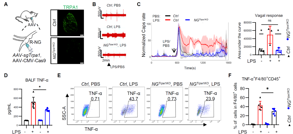 研究团队发现,迷走神经NG感觉神经元通过 MYD88 依赖的机制感知气道内LPS,并驱动肺部炎症反应。特异性敲除 NG中的Myd88 显著减弱LPS诱导的迷走神经电兴奋,NG神经元的激活,以及肺部炎症因子的表达;而在NG 特异性回补Myd88 可逆转上述效应。进一步研究显示NG神经元表达的TRPA1并非TLR4(Cell,2024)是在肺内识别LPS进而促进迷走神经电兴奋的关键分子。在NG上特异性剔除TRPA1会显著降低肺内LPS刺激引起的迷走神经电兴奋和炎症因子水平(图2)。