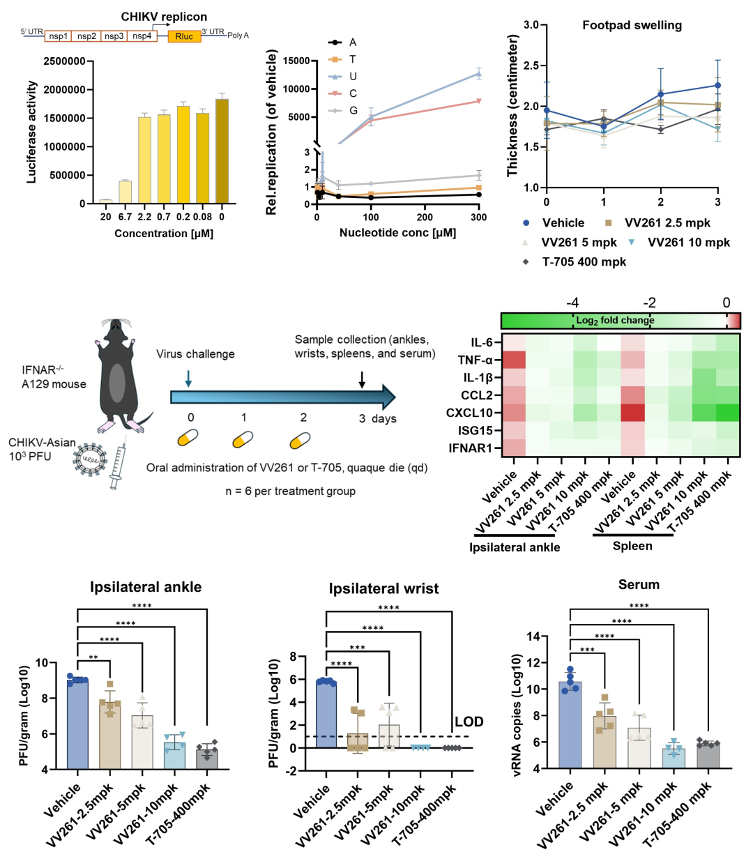 本次研究结果表明,VV261在多种细胞模型中可高效抑制不同流行谱系的CHIKV(包括Asian型和ECSA型)复制,并对另一种甲病毒属成员辛德毕斯病毒(SINV)同样表现出抑制活性。在基孔肯雅病毒感染的Ifnar1缺失(A129)小鼠模型中,VV261各剂量组(口服给药2.5、5和10 mg/kg)均能显著缓解感染所致的关节肿胀,并有效降低小鼠踝、腕、脾脏等组织、器官中的病毒载量和炎症因子的表达水平。