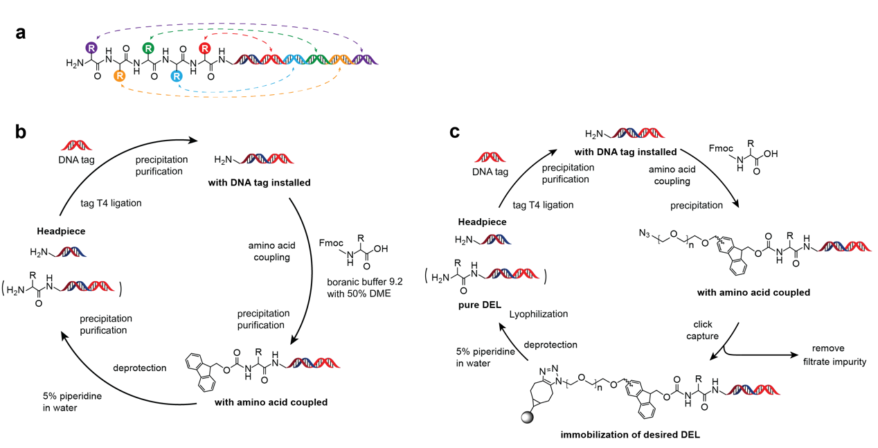 图1. 传统DNA编码多肽文库与基于 mFmoc 氨基酸纯化策略构建PDEL的示意图