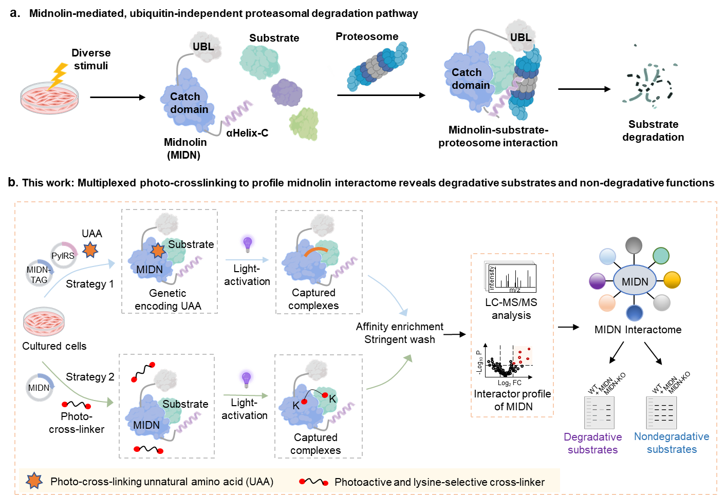 图1. 本工作发展的多重光交联化学生物学策略,揭示Midnolin蛋白质互作组及其介导的非泛素依赖降解底物