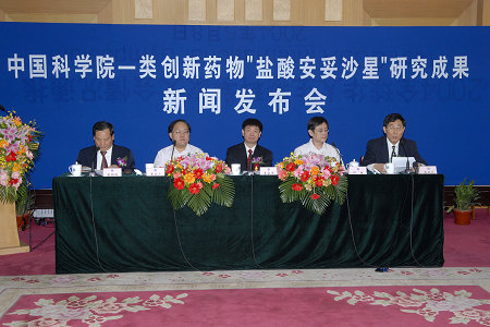 5月31日,由上海药物所研制的一类创新药物“盐酸安妥沙星”研究成果新闻发布会在京举行。新闻发布会由中科院新闻发言人、办公厅主任蒋协助主持。中科院副院长李家洋院士、卫生部科技教育司副司长何维、科技部生物技术发展研究中心主任王宏广、中科院生物局局长张知彬、副局长苏荣辉、上海分院副院长朱志远、上海生科院副院长张旭、上海药物所原所长、所学术委员会主任陈凯先院士、上海药物所所长丁健、党委书记成建军、蚌埠市副市长何娅及安徽环球药业董事长王祥等出席新闻发布会。首都19家新闻媒体参加了新闻发布会。