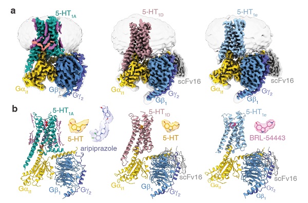 图1. 三种5-羟色胺受体结合不同配体的冷冻电镜结构