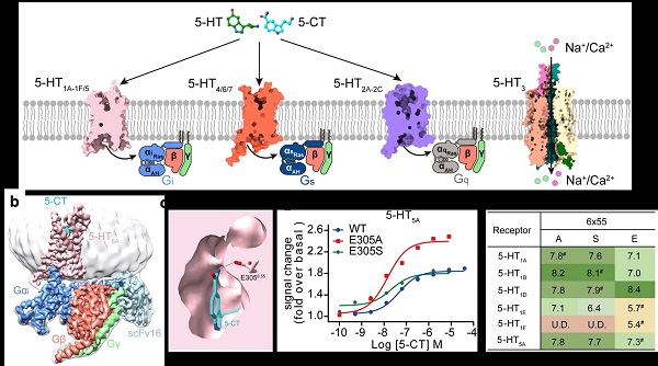 五羟色胺受体广泛表达于中枢和外周神经系统,调节人体神经行为。该家族受体与神经系统病理学密切相关,是治疗神经系统疾病重要的一类药物靶点。5-HT受体家族由7种不同的亚型(5-HT1-7),共14种亚型组成,其中13种是G蛋白偶联受体(GPCRs),通过偶联下游Gs、Gi/o和Gq三条主要的信号通路发挥生理功能(图1a)。作为5-HT受体家族中的重要成员,5-HT5A参与记忆、学习和食物摄入的调节,其特异性配体在治疗精神病、抑郁症、精神分裂症和神经性疼痛方面显示出巨大潜力,5-HT5A选择性药物的开发将为这些神经系统疾病的治疗提供新契机。