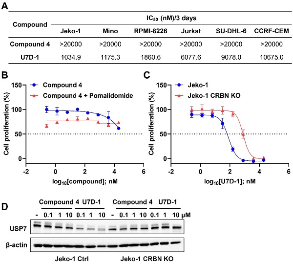 U7D-1在RS4;11细胞中能高选择性地降解USP7,同时对p53野生型癌细胞的生长表现出比USP7抑制剂相当或者更强的抑制活性。更重要的是,U7D-1在p53突变型癌细胞系中仍显示出较强的生长抑制活性,而USP7抑制剂则几乎没有活性。作用机制研究表明U7D-1的抗肿瘤活性主要源于对USP7的降解。