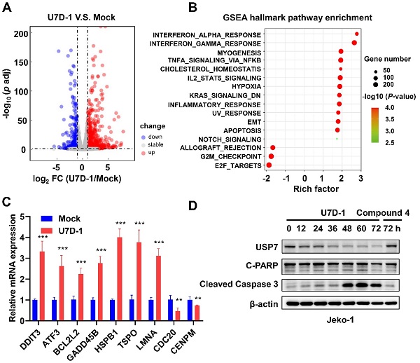 为进一步探究作用机理,研究团队进行了转录组分析,结果表明U7D-1能显著上调凋亡通路相关基因的表达,而下调E2F通路相关基因的表达,推测USP7降解可能通过调节凋亡和E2F通路而对p53突变型癌细胞发挥抗肿瘤活性。上述结果表明靶向USP7降解有可能为p53突变型癌症提供一种新的治疗策略。