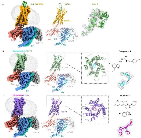 图1. RXFP4–Gi分别结合INSL5、Compound 4和DC591053的冷冻电镜结构。a,INSL5–RXFP4–Gi复合物结构;b,Compound 4–RXFP4–Gi复合物结构及Compound 4的化学结构;c,DC591053–RXFP4–Gi复合物结构及DC591053的化学结构。