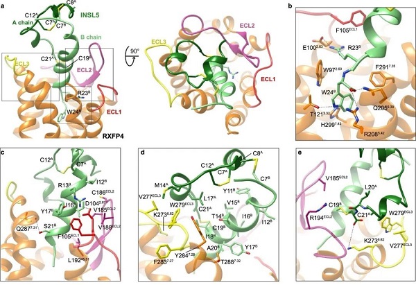 图2. RXFP4识别INSL5的结构基础。a,INSL5与RXFP4结合的整体示意图;b,INSL5的B链羧基末端R23B和W24B深入RXFP4的正构位点并形成多个极性相互作用;c-e,RXFP4胞外环参与INSL5的识别。