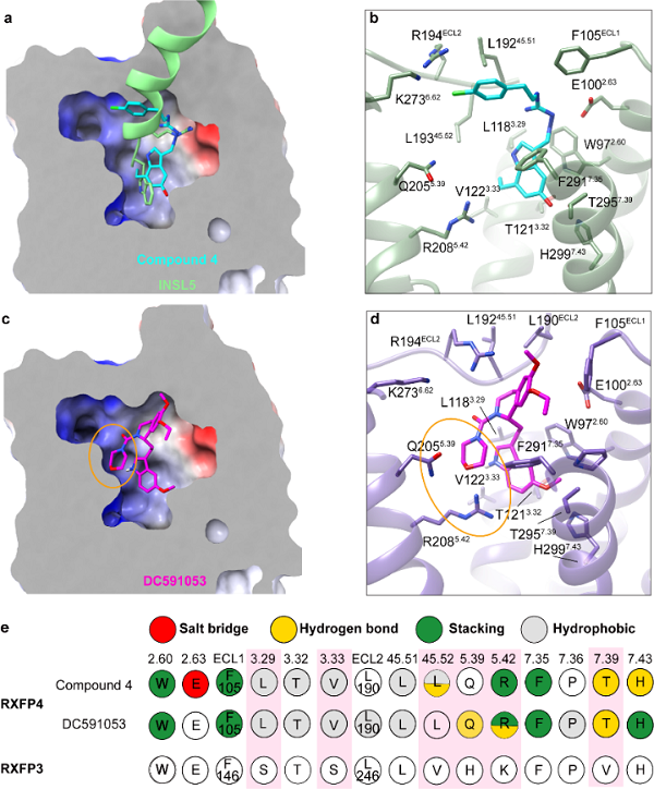 图3. 小分子激动剂的拟肽作用及和DC591053选择性激活RXFP4的分子机制。a,Compound 4的结合口袋截面图;b,Compound 4与RXFP4的相互作用;c,DC591053特异性激活RXFP4;d,DC591053结合口袋截面图;e,小分子激动剂与受体相互作用模式示意。
