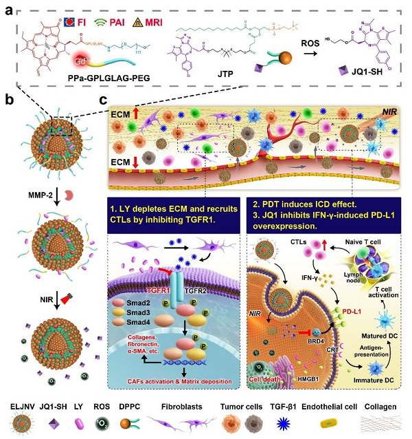 科研人员首先利用生物信息学分析发现TGFBR1在多种实体瘤中显著上调。激活的TGF-β信号通路可促进肿瘤相关成纤维细胞(cancer-associated fibroblasts, CAF)分泌细胞外基质,形成“物理屏障”,阻碍细胞毒性T淋巴细胞(cytotoxic T lymphocytes, CTLs)向肿瘤内浸润,上调调节性T细胞(regulatory T cells, Tregs),进而导致免疫抑制微环境。为了克服TGF-β信号通路介导的免疫耐受,研究团队设计了一种包载TGF-β受体1抑制剂和光敏剂焦脱镁叶绿酸a(Pyropheophorbide-a, PPa)的酶激活纳米囊泡(ELNV)。其中,PPa螯合钆离子(gadolinium, Gd3+)后能够实现荧光、光声和磁共振多模态成像,引导671 nm波长近红外光精准照射肿瘤部位。在671 nm激光照射下,PPa可发挥光动力作用生成活性氧,促进药物释放并触发肿瘤细胞的免疫原性细胞死亡,提高肿瘤细胞的免疫原性、招募肿瘤浸润CTLs。为了进一步克服IFN-γ诱导的肿瘤细胞表面PD-L1表达和获得性免疫耐受,科研人员在ELNV纳米囊泡中包裹ROS响应的BRD4抑制剂JQ1,得到共递送前药纳米囊泡(称为ELJNV)。小鼠水平的抗肿瘤药效评价结果表明,ELJNV可以有效抑制多种免疫排斥型肿瘤生长、转移和复发。本研究有望为IETs的高效免疫治疗提供重要参考。