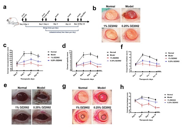 本研究首次证实了候选新药 DZ2002可以显著缓解 BAC诱导的蒸发过强型干眼模型和SCOP诱导的泪液分泌不足型干眼模型的干眼症状,抑制炎症和血管新生相关基因的表达。体外试验结果同样揭示,DZ2002可显著地抑制TNF- 诱导HUVECs的生物学功能改变,发挥抗血管生成和抗炎效应,为干眼症的药物开发和DZ2002的临床应用提供了新的研发基础。