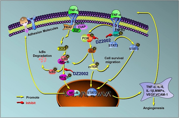 图2. DZ2002通过抑制STAT3-PI3K-Akt-NF- B信号通路抑制血管生成和炎症。DZ2002通过下调I B的降解和磷酸化以及NF- B的磷酸化和核移位来抑制TNF- 诱导的NF- B信号转导;DZ2002抑制STAT3-PI3K-Akt信号通路上下游信号分子的激活,抑制炎症因子和促血管生成因子的分泌。