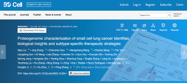 2024年1月5日,国际顶级学术期刊Cell在线发表了中国科学院上海药物研究所周虎研究员团队与同济大学附属上海市肺科医院张鹏教授团队、中国科学院分子细胞科学卓越创新中心季红斌研究员团队和高大明研究员团队合作的题为“Proteogenomic Characterization of Small Cell Lung Cancer Identifies Biological Insights and Subtype-Specific Therapeutic Strategies”的最新成果。