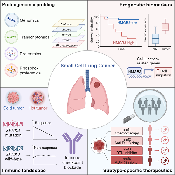 该研究对小细胞肺癌患者的肿瘤组织和配对癌旁组织样本进行了蛋白基因组学(proteogenomics)分析,通过整合基因组、转录组、蛋白质组、磷酸化蛋白质组等多维组学数据,系统揭示了小细胞肺癌的分子特征,提出新的分子分型及其针对性的个体化治疗策略,为深入理解小细胞肺癌的发病机制和改善临床治疗策略奠定了坚实的基础。
