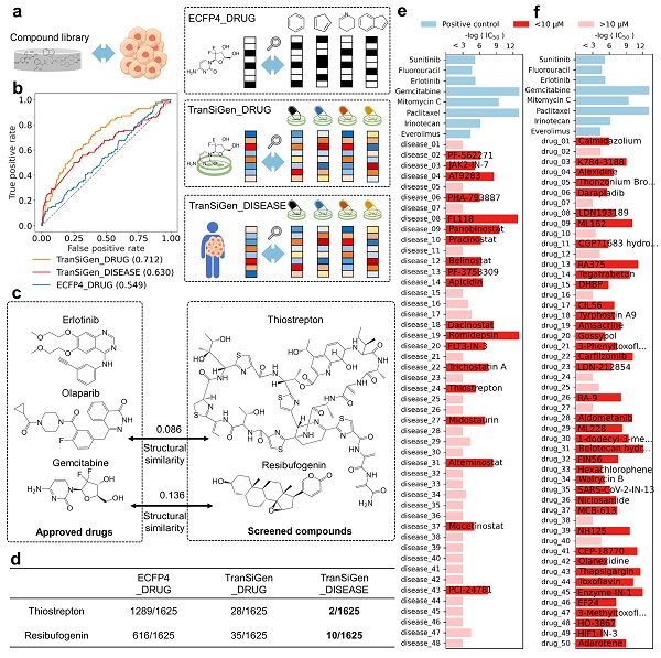 此外,TranSiGen表征在各种下游任务中展现出了有效性,包括基于配体的虚拟筛选、药物响应预测和基于表型的药物重定向。利用TranSiGen进行抗胰腺癌活性化合物虚拟筛选(图2),体外实验验证结果展现出高命中率,这一结果显示了TranSiGen在药物筛选方面的潜力。