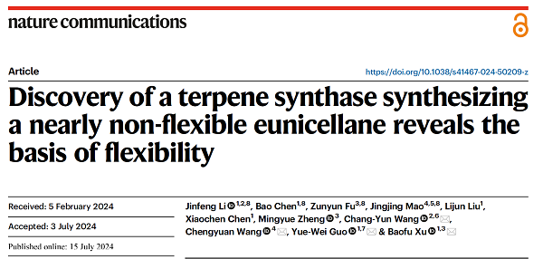 2024年7月15日,中国科学院上海药物研究所郭跃伟团队、烟台新药创制山东省实验室徐宝福团队联合中国科学院上海感染与免疫研究所王程远教授、中国海洋大学王长云教授团队在国际期刊Nature Communications上发表题为“Discovery of a terpene synthase synthesizing a nearly non-flexible eunicellane reveals the basis of flexibility”的研究论文,系统针对非柔性eunicellane二萜骨架合酶的生物合成机制以及相关的非柔性机理进行研究,回答了eunicellane家族化合物特有的构象动态变化问题,为eunicellane家族化合物的合成生物学生产体系构建以及构象控制等奠定了理论基础。