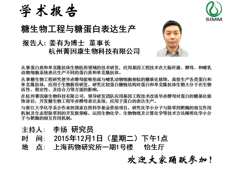 第113期:糖生物工程与糖蛋白表达生产;报告人:姜有为 博士;主持人:李扬 研究员;时间:12月1日;地点:怡生厅