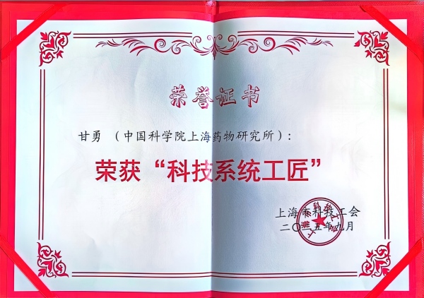 上海药物所甘勇研究员获评上海市2025年度“科技系统工匠”