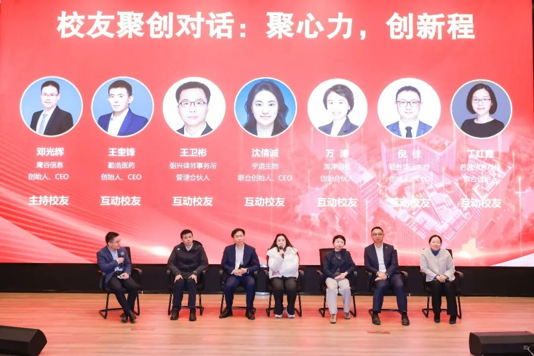 在“聚心力,创新程”校友对话环节,鹰谷信息创始人、CEO邓光辉博士与六位跨领域校友围绕当前行业挑战与机遇展开交流,并分享了多个校友网络促成的合作案例,体现出强大的社群凝聚力。